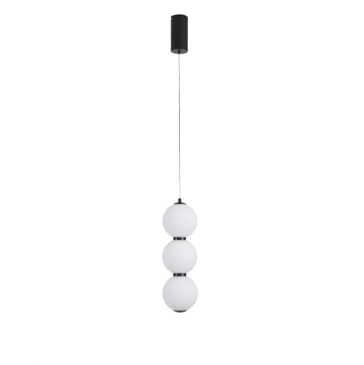 Pendulul PERLA are trei sfere de sticlă dispuse una deasupra celeilalte, separate prin inele negre.